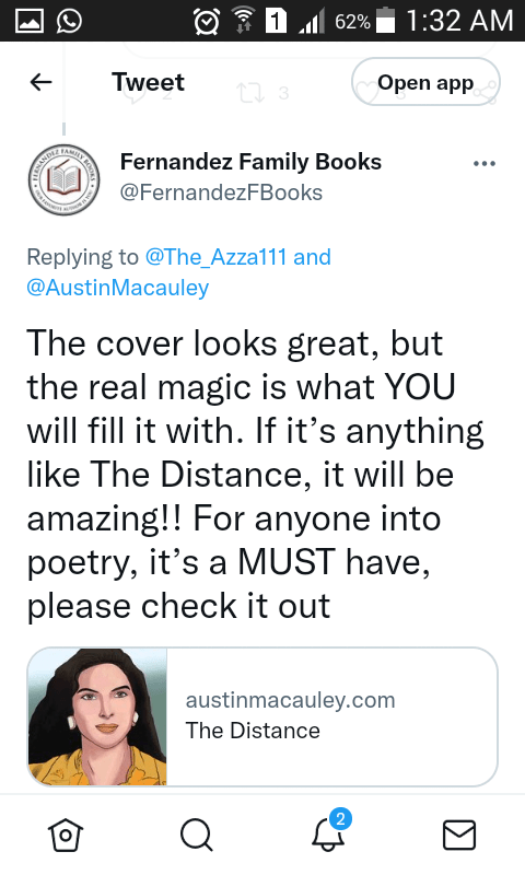 My poetry book “The Distance” received a remarkable review on X twitter from Fernandez Family Books, and my publishers “Austin Macauley” published a very nice and heartwarming comment on it!.